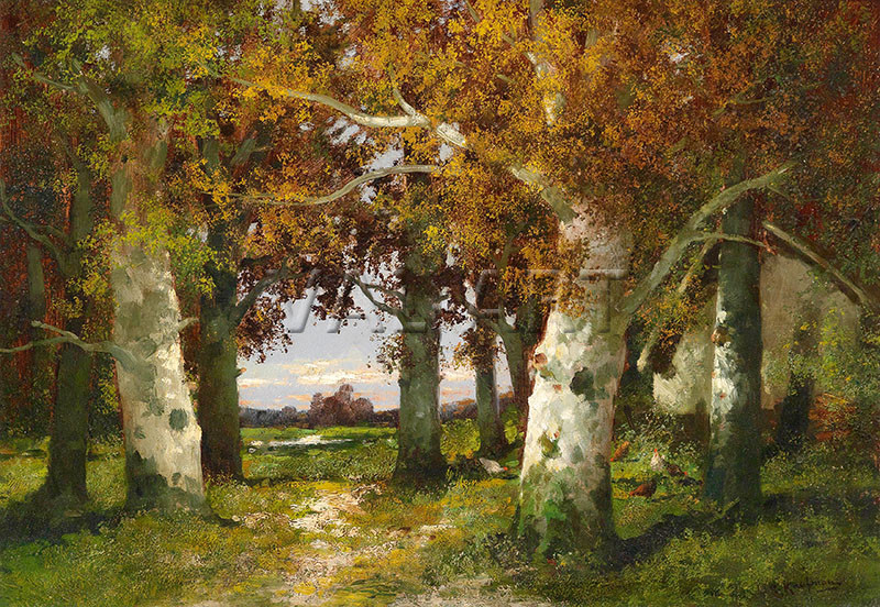 Адолф Кауфман (1848 – 1916) е изтъкнат австрийски пейзажист и маринист. По време на престоя си във Франция, особено през 1870-те, той е силно повлиян от Барбизонската школа и зараждащия се стил „пейзаж във времето“. Тези движения наблягат на реалистичните изображения на провинцията, прякото наблюдение на природата и интимното, често поетично изобразяване на пейзажите. Кауфман усвоява тези принципи, които се превръщат в отличителни белези на неговото творчество. Картините му са предимно пейзажи, с особена привързаност към горските сцени, изобразени през различни сезони. Способността му да улавя фините нюанси на светлината и атмосферата, текстурите на природния свят – от гъсти гори до спокойни води – му носи значително признание. Творбите на Адолф Кауфман са силно търсени и придобивани от видни колекционери, включително членове на европейското кралско семейство и благородници като император Наполеон III, принцеса Стефани Белгийска, ерцхерцог Фридрих, херцог на Тешен, цар Николай II на Русия и кралица Изабела II на Испания. Това покровителство подчертава широката популярност и ценното качество на неговото изкуство, осигурявайки наследството му като значителен принос към европейската пейзажна живопис от края на 19-ти и началото на 20-ти век.