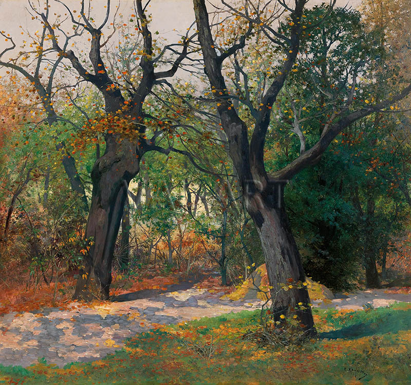 Адолф Кауфман (1848 – 1916) е изтъкнат австрийски пейзажист и маринист. По време на престоя си във Франция, особено през 1870-те, той е силно повлиян от Барбизонската школа и зараждащия се стил „пейзаж във времето“. Тези движения наблягат на реалистичните изображения на провинцията, прякото наблюдение на природата и интимното, често поетично изобразяване на пейзажите. Кауфман усвоява тези принципи, които се превръщат в отличителни белези на неговото творчество. Картините му са предимно пейзажи, с особена привързаност към горските сцени, изобразени през различни сезони. Способността му да улавя фините нюанси на светлината и атмосферата, текстурите на природния свят – от гъсти гори до спокойни води – му носи значително признание. Творбите на Адолф Кауфман са силно търсени и придобивани от видни колекционери, включително членове на европейското кралско семейство и благородници като император Наполеон III, принцеса Стефани Белгийска, ерцхерцог Фридрих, херцог на Тешен, цар Николай II на Русия и кралица Изабела II на Испания. Това покровителство подчертава широката популярност и ценното качество на неговото изкуство, осигурявайки наследството му като значителен принос към европейската пейзажна живопис от края на 19-ти и началото на 20-ти век.
