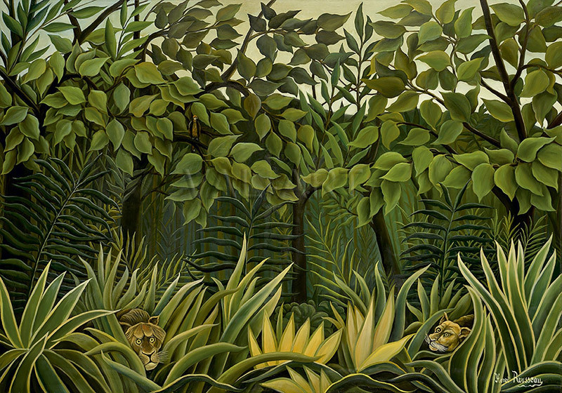 Анри Русо (1844-1910) е френски художник-постимпресионист, известен със своите ярки сцени в джунглата и наивен артистичен стил, който получава признание посмъртно въпреки първоначалните подигравки. Произхожда от скромно семейство и се мести в Париж през 1868 г., където започва да работи като събирач на данъци, работа, която му носи прякора „Митничаря“. Русо започва сериозно да рисува в началото на четиридесетте си години, до голяма степен самоук и повлиян от природата. Творчеството му започва да привлича вниманието на авангардни художници, включително Пабло Пикасо и Анри Матис, които оценяват неговата оригиналност и искреност. Русо е най-известен със своите буйни сцени в джунглата. Интересното е, че никога не е пътувал до джунглите, които е изобразявал; вместо това е черпил вдъхновение от посещенията на парижкия зоопарк и ботанически градини. Картините му често изобразяват екзотични животни и фигури, смесвайки фантазията с реалността. Наивният стил на Русо, белязан от липса на перспектива и пропорции, първоначално е осмиван, но по-късно е оценен заради уникалния си чар и емоционална дълбочина. Творчеството му получава значително признание след смъртта му, повлиявайки на различни художествени движения, включително сюрреализъм и фовизъм.