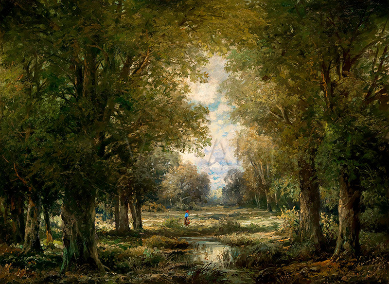 Адолф Кауфман (1848 – 1916) е изтъкнат австрийски пейзажист и маринист. По време на престоя си във Франция, особено през 1870-те, той е силно повлиян от Барбизонската школа и зараждащия се стил „пейзаж във времето“. Тези движения наблягат на реалистичните изображения на провинцията, прякото наблюдение на природата и интимното, често поетично изобразяване на пейзажите. Кауфман усвоява тези принципи, които се превръщат в отличителни белези на неговото творчество. Картините му са предимно пейзажи, с особена привързаност към горските сцени, изобразени през различни сезони. Способността му да улавя фините нюанси на светлината и атмосферата, текстурите на природния свят – от гъсти гори до спокойни води – му носи значително признание. Творбите на Адолф Кауфман са силно търсени и придобивани от видни колекционери, включително членове на европейското кралско семейство и благородници като император Наполеон III, принцеса Стефани Белгийска, ерцхерцог Фридрих, херцог на Тешен, цар Николай II на Русия и кралица Изабела II на Испания. Това покровителство подчертава широката популярност и ценното качество на неговото изкуство, осигурявайки наследството му като значителен принос към европейската пейзажна живопис от края на 19-ти и началото на 20-ти век.