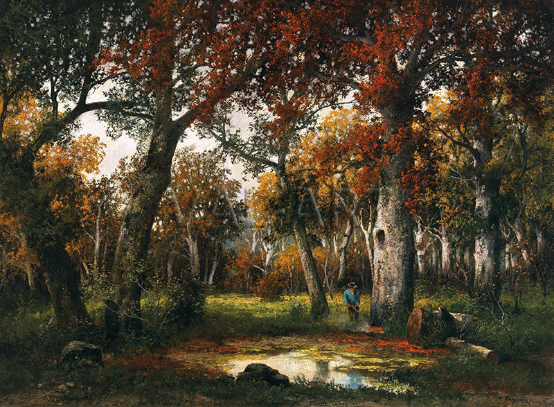 Адолф Кауфман (1848 – 1916) е изтъкнат австрийски пейзажист и маринист. По време на престоя си във Франция, особено през 1870-те, той е силно повлиян от Барбизонската школа и зараждащия се стил „пейзаж във времето“. Тези движения наблягат на реалистичните изображения на провинцията, прякото наблюдение на природата и интимното, често поетично изобразяване на пейзажите. Кауфман усвоява тези принципи, които се превръщат в отличителни белези на неговото творчество. Картините му са предимно пейзажи, с особена привързаност към горските сцени, изобразени през различни сезони. Способността му да улавя фините нюанси на светлината и атмосферата, текстурите на природния свят – от гъсти гори до спокойни води – му носи значително признание. Творбите на Адолф Кауфман са силно търсени и придобивани от видни колекционери, включително членове на европейското кралско семейство и благородници като император Наполеон III, принцеса Стефани Белгийска, ерцхерцог Фридрих, херцог на Тешен, цар Николай II на Русия и кралица Изабела II на Испания. Това покровителство подчертава широката популярност и ценното качество на неговото изкуство, осигурявайки наследството му като значителен принос към европейската пейзажна живопис от края на 19-ти и началото на 20-ти век.