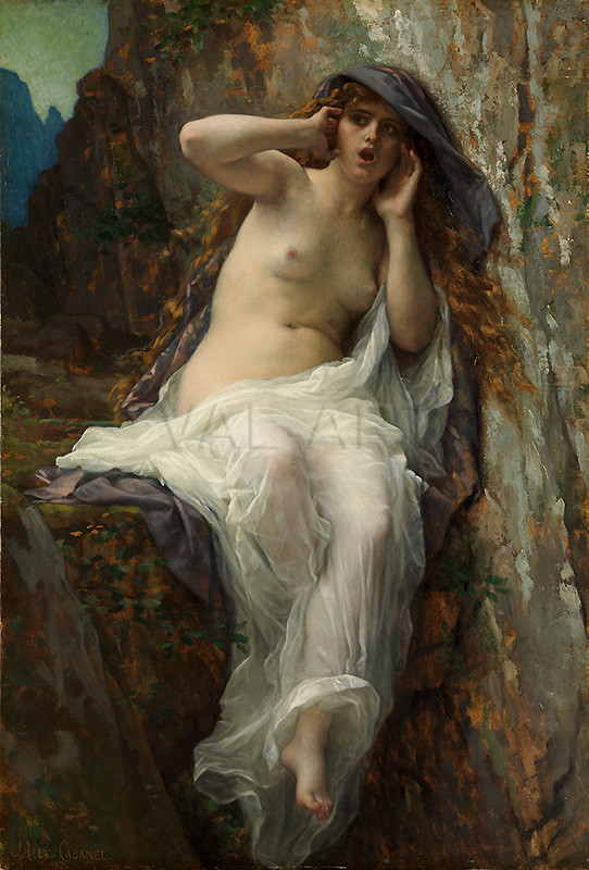 Александър Кабанел (1823–1889) е френски академичен художник, известен със своите изпипани и педантично изпълнени исторически, митологични и алегорични картини. Той е видна фигура във френската академична художествена сцена на 19-ти век и постига значителен успех и признание през живота си. Кабанел се придържа към академичния стил на рисуване, който се характеризира с педантично внимание към детайлите, прецизно изобразяване и гладък, полиран завършек. Картините му често демонстрират майсторство на анатомията и задълбочено разбиране на класическата естетика. Той получава множество награди и отличия през цялата си кариера, включително Ордена на Почетния легион. Докато Кабанел се радва на широк успех през живота си, неговата отдаденост на академичните традиции го прави мишена за критика през по-късната част на 19-ти век, когато авангардните движения оспорват академичните норми. През 20-ти век репутацията му претърпява упадък поради възхода на модернистичните движения, но през последните години се наблюдава подновен интерес към творчеството му, като историците на изкуството преоценяват приноса му към академичното изкуство на 19-ти век.