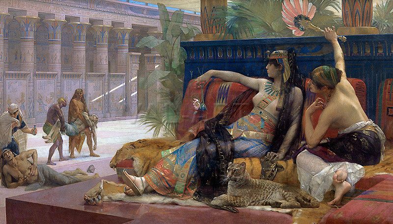 Клеопатра тества отрови върху осъдени затворници (1887) Картината е вдъхновена от „Животът на Антоний“ на Плутарх, в който се описва как Клеопатра тества различни смъртоносни токсини върху затворници, за да открие най-ефективния и безболезнен метод за евентуалното си самоубийство. Клеопатра е изобразена да се излежава в луксозен, сенчест интериор, обгрижвана от слугиня и придружена от леопард, символизиращ нейната царствена власт. Тя наблюдава със студен, откъснат поглед как затворници на обления от слънце фон се гърчат в агония или биват отнасяни като трупове след отравяне. Картината съчетава историческа точност с „Египтомания“ от 19-ти век. Драматичната ѝ композиция е повлияла значително на по-късните сценични пиеси и ранните неми филми, изобразяващи живота на египетската царица.