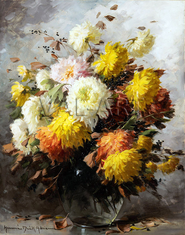 Ейдриан Ненсън Дийк (1890 - 1956) е видна унгарска художничка, известна със своите детайлни и наситени с цвят натюрморти. Творбите ѝ се характеризират с импресионистичен подход и умело предаване на светлината и текстурите. Тя се утвърждава като майстор на флоралните натюрморти (цветя във вази), често изобразявайки божури, рози, люляци и маргаритки. Нейни произведения редовно се предлагат в големи аукционни къщи като Christie’s, като през последните години има засилен интерес към нейни творби в САЩ и Европа.