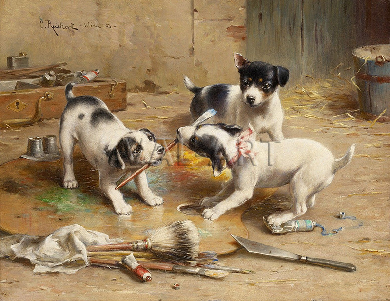 Карл Райхерт (1836–1918) е австрийски художник, роден през 1836 г. във Виена. Той е най-известен със своите картини с изображения на животни и пейзажи, често характеризиращи се с прецизни детайли и живи цветове. Райхерт учи в Художествената академия в Грац и е общувал със съвременни художници като Хейууд Харди и Хенриет Ронер-Книп. През цялата си кариера той участва в множество изложби, получавайки признание за приноса си към жанра на анималистичната живопис. Умира през 1918 г. в Грац, оставяйки след себе си наследство от детайлно изкуство с изображения на животни и природа, което е привлекателно за колекционерите на жанра.