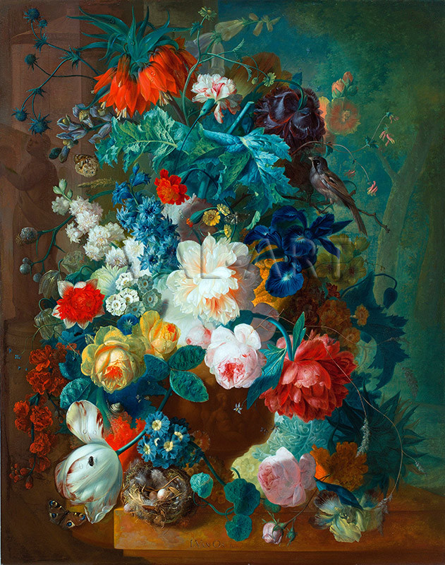 Ян ван Ос (1744 – 1808) е холандски художник и член на известното семейство художници Ван Ос. Той е известен най-вече с натюрмортите си с плодове и цветя, въпреки че започва кариерата си с морски пейзажи. Неговите флорални натюрморти са рисувани в стила на Ян ван Хюйсум, като цветята обикновено са представени върху мраморен перваз на зелен фон. Ян ван Ос не е пряко свързан с бароковото движение, но творчеството му отразява неокласическия стил, който е бил преобладаващ по време на живота му. Неговите картини, особено тези, изобразяващи натюрморти с плодове и цветя, показват неокласическите идеали за ред, баланс и класическа красота. Стилът на Ван Ос се характеризира с използването на цвят, композиция и представяне на природата, което е в съответствие с неокласическия подход към изкуството. Неговото влияние се простира отвъд собственото му творчество, тъй като той е преподавал и вдъхновявал много художници, допринасяйки за развитието на холандското изкуство през 18-ти и 19-ти век.