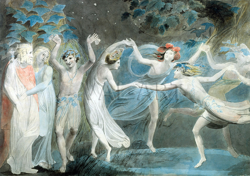 Оберон, Титания и Пък с танцуващи феи (1786) е значимо произведение, което улавя същността на „Сън в лятна нощ“ на Шекспир по причудлив и очарователен начин. Картината, създадена около 1786 г., изобразява Краля на феите Оберон и неговата кралица Титания, заедно с палавата фея Пък, докато наблюдават танцуващите феи в гориста обстановка. Творбите на Блейк се характеризират с ефирни цветове и съноподобност, отразяващи магическата атмосфера на пиесата. Движенията на феите са плавни и грациозни, а детайлните изражения на героите допринасят за цялостния очарователен ефект на илюстрацията. Това произведение е част от разнообразната колекция на Блейк, която включва редица произведения, възприемащи въображението като „тялото на Бог“ или „самото човешко съществуване“.