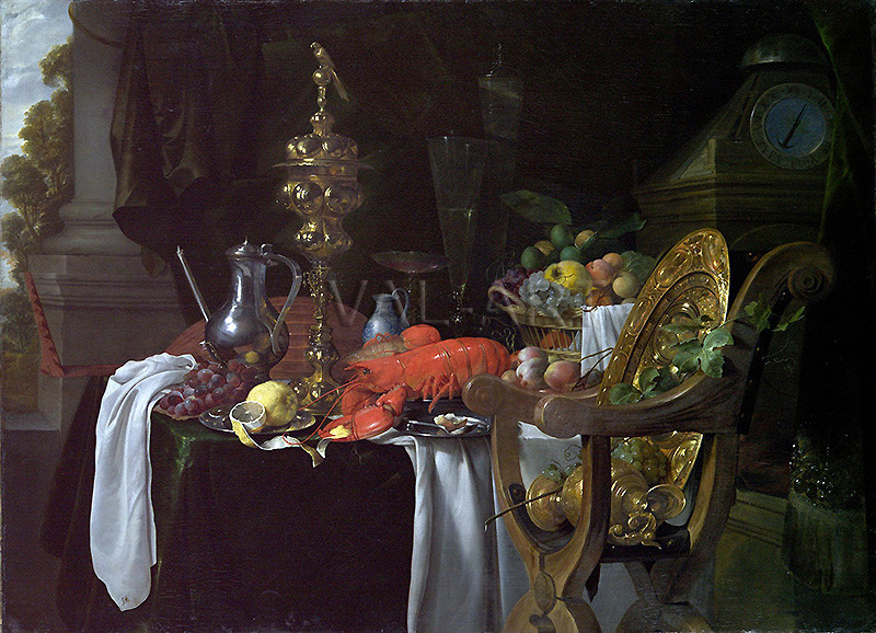 Ян Давидс де Хеем (1606-1684) е един от най-великите барокови художници на натюрморти в Холандия. Най-многобройните и характерни негови произведения са аранжировки от цветя, плодове, метални чинии и чаши за вино, композиции от книги и музикални инструменти. В Антверпен, крепост на контрареформацията, де Хеем е свидетел на пълната сила на фламандския барок - по-специално на високодраматичното творчество на Петер Паул Рубенс, който по това време е на близо 60 години и ръководи голямо и успешно студио. Творчеството на Де Хеем се разширява по размер и стил. Между 1640 и 1643 г. той представя серия от четири огромни, разкошни натюрморта, които съчетават цвят, светлина и прецизни детайли, за да изобразят изобилие от изискани храни, изящни тъкани и луксозни предмети от цял свят: синьо-бял порцелан от Китай, стъклария от Венеция, черен пипер от Индия, тютюн от Западна Индия и черупки от морски охлюви от Индийския и Тихия океан. От сто или повече негови картини, показвани в европейски галерии, само 18 са датирани.
