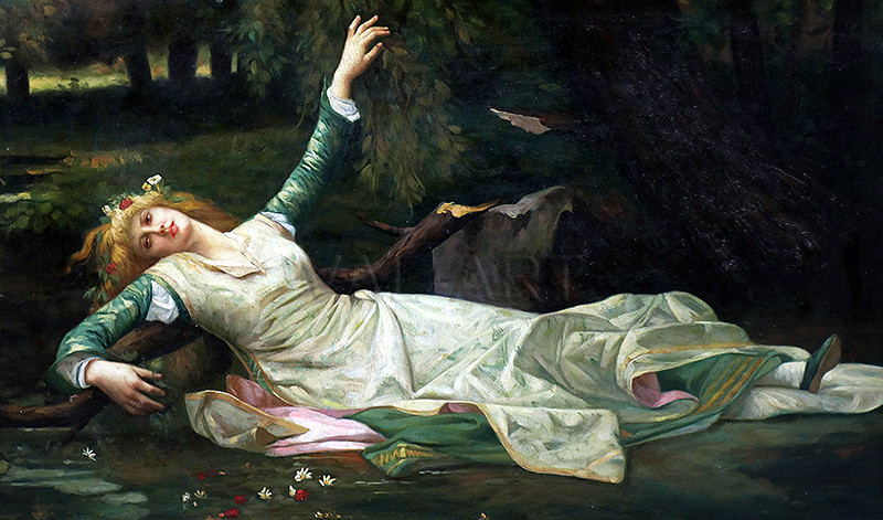 Офелия (1883) Картината изобразява сцена от пиесата „Хамлет“ на Уилям Шекспир, когато главната героиня Офелия, водена от лудост, е на път да се самоубие в езеро. Тази сцена често е изобразявана от романтичните художници на 19-ти век. В картината момичето е изобразено легнало, с отметната назад глава, уморени очи, дясната ѝ ръка и гръб са отпуснати на счупен клон, докато лявата ѝ ръка стиска клон на плачеща върба. Офелия носи небесносиня рокля, която изглежда толкова лека, че сякаш се носи във водата. Цветя, включително маргаритки и иглики, лежат върху спокойните води на езерото, същите, които образуват короната от цветя, която Офелия носи в русата си коса. Светлата кожа на момичето се откроява в контраст с мрака на гората и блатото. Оставайки верен на историческите и литературни сюжети като теми за своите картини, тази творба изобразява може би най-сложния и ярък персонаж, увековечен в „Хамлет“ на Шекспир – Офелия. Толкова завладяващ герой, тя е очаровала художниците от векове, изобразена широко от викториански майстори, като сър Томас Франсис Дикси, Джон Еверет Миле и Джон Уилям Уотърхаус, наред с други.