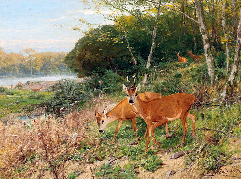 Кристиан Йохан Кронер (1838-1911) е ключова фигура в пейзажната традиция на Германия, особено през късния романтизъм и началото на 20-ти век. Стилът на Кронер обаче остава здраво вкоренен в романтичните конвенции, като дава приоритет на експресивната работа с четката и емоционалния резонанс пред стриктното придържане към фотографския реализъм. Изображенията на Кронер на животни – особено на елени – са били ценени заради анатомичната си прецизност и емоционално качество. Той щателно изучава мускулатурата и скелетната структура на животните, превръщайки научните си знания в завладяващи визуални изображения. Тези картини се характеризират със светещи цветови палитри и динамични композиции, които предават усещане за движение и жизненост. Неговата непоколебима отдаденост на наблюдението и интерпретирането на природата, съчетана с майсторството му на техниката на рисуване, го утвърждава като защитник на романтичния идеализъм и затвърждава мястото му сред най-уважаваните пейзажисти в Германия.
