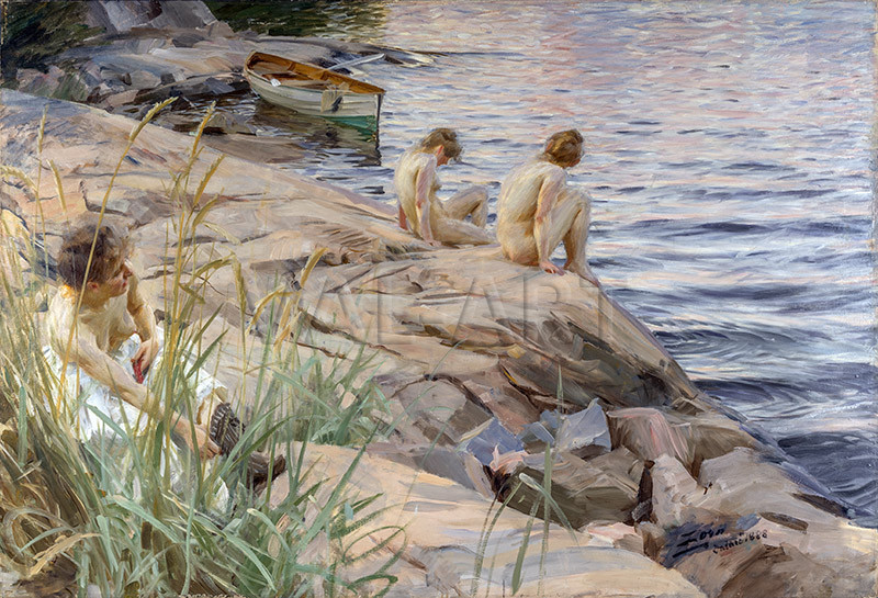 Андерс Цорн (1860-1920) е един от най - забележителните шведски художници, чиито произведения са характерни с ярките си цветове, натуралистични изображения и умело използване на светлината. Неговият широкообхватен стил черпи вдъхновение от много източници, включително шведското изкуство, импресионизма и символизма. Цорн е един от първите художници, рисуващи голи тела на открито (пленер), улавяйки взаимодействието на светлината и водата върху кожата.  Въпреки че той и съпругата му Ема са били отдадени един на друг, Цорн е бил голям женкар и е бил известен с многобройните си афери. Той е бил разочарован от резултатите, когато е позирал модела. Едва след като ѝ е позволил да се държи естествено, е бил доволен от постигнатото. В мемоарите си той пише: „Опитах се да поставя модела си в различни позиции, за да постигна този или онзи ефект. Но едва когато ѝ е позволих да си почине и да се почувства незабелязана, открих картината си.“