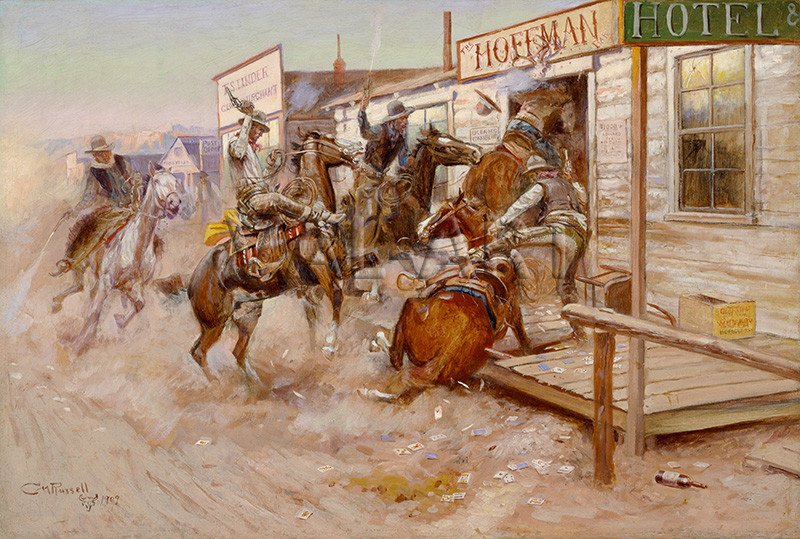 Чарлз Марион Ръсел (1864-1926) e американски самоук художник, един от най-известните и възхвалявани артисти на великия американски запад. Скоро става известен като „художника каубой“, въпреки че рисува и индианци, жени, и диви животни. Много от неговите сцени, изобразяващи здрач, включват живи оранжеви, лилави и сини цветове, като по този начин ефективно предават атмосферата. Вдъхновяван от заобикалящата го среда, реалист, Ръсел рисува това, което вижда. Живее сред жестоките индианци от племето Чернокраки в Южна Канада, като работите му се основават на времето, прекарано в близост до тях. Познанията на Ръсел от първа ръка го правят съпричастен и го изпълват с благоговение към културата на индианците, което резонира силно в картините му за тях. Художникът научава езика им и събира артефакти, много от които са използвани в неговите картини. В крайна сметка той построява голяма сграда, която служи като студио и складово пространство, за да приюти нарастващата му колекция от индиански дрехи, утилитарни предмети, оръжия, каубойски екипировки, „конски бижута“ и други западни реквизити, полезни при изобразяването на сцени от Стария Запад.