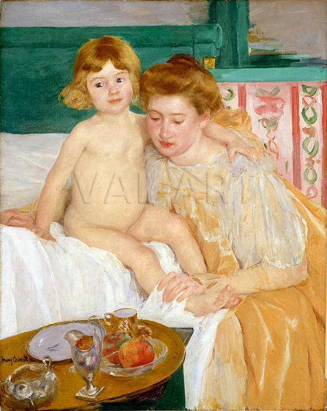 Майка и дете (Детето се събужда) (1889)Тази картина се фокусира върху връзката между майката и детето, което се превръща в специалитет на Касат след 1890 г. Художничката променя популярната импресионистична тема за възрастните къпещи се жени, като показва майчинско отношение - красиво облечената жена мие детето си. Счита се, че русото, синеоко малко дете е било момче на име Джулс, един от честите модели на Касат. Платното с наситен колорит и нетрадиционна обработка на пространството е първото на Касат, което влиза в колекцията на Метрополитън.