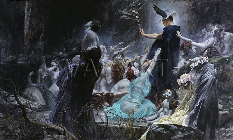 Адолф Хиреми-Хиршъл (1860–1933) е унгарско-австрийски художник, майстор на много жанрове във визуалните изкуства, от академизма до постимпресионизма, символизма и ар нуво. Той е известен най-вече с мащабните си исторически и митологични платна, които често изследват темите за смъртта, преходността и античността. Фокусира се върху античния свят (особено Древен Рим) и гръцката митология. Работите му често имат меланхоличен или трагичен оттенък, разглеждайки съдбата на човешката душа и края на цивилизациите. Използва драматично осветление и сложни многофигурни композиции. Фигурите му са анатомично прецизни, следващи строгите правила на Виенската академия, но често са обвити в ефирна, почти призрачна атмосфера. Използва приглушени, тъмни тонове, прекъсвани от фосфоресциращи или ефирни светлини, които придават на сцените му неземен вид. Най-известните му творби могат да бъдат видяни в галерия Белведере във Виена.