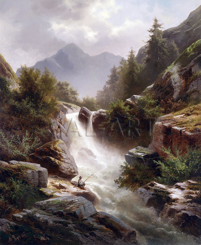 Алберт Ригер (1834–1905) е изтъкнат австрийски художник от XIX век, известен със своите пейзажи. Специализира се в изобразяването на планински масиви (особено Алпите), крайбрежни пейзажи и изгледи от Виена. Творбите му се отличават с майсторско използване на светлината и сенките, често в меланхолична или драматична атмосфера. Служи си с предимно тъмни и приглушени тонове, за да предаде суровата красота на природата. Стилът на Алберт Ригер се дефинира като реализъм с подчертани романтични елементи. Като представител на австрийската школа, той обръща изключително внимание на детайлите – текстурата на скалите, движението на облаците и реалистичното изобразяване на водата - планински потоци, езера. Днес негови картини се предлагат в големи аукционни къщи, като продължават да бъдат ценени от колекционерите на класически европейски пейзаж.