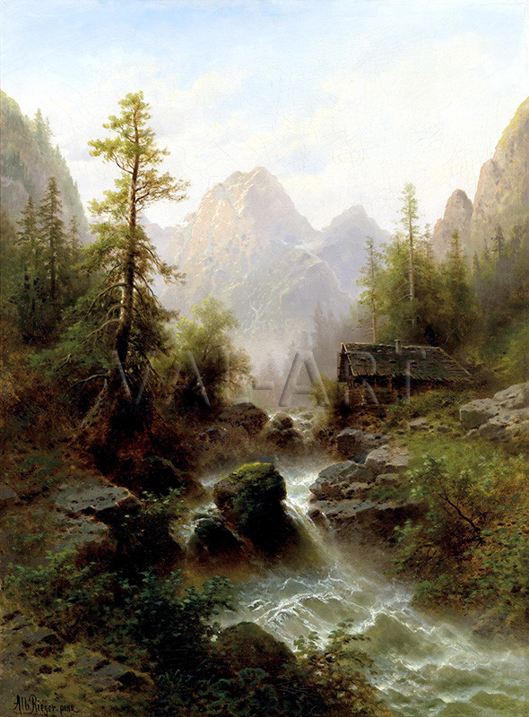 Алберт Ригер (1834–1905) е изтъкнат австрийски художник от XIX век, известен със своите пейзажи. Специализира се в изобразяването на планински масиви (особено Алпите), крайбрежни пейзажи и изгледи от Виена. Творбите му се отличават с майсторско използване на светлината и сенките, често в меланхолична или драматична атмосфера. Служи си с предимно тъмни и приглушени тонове, за да предаде суровата красота на природата. Стилът на Алберт Ригер се дефинира като реализъм с подчертани романтични елементи. Като представител на австрийската школа, той обръща изключително внимание на детайлите – текстурата на скалите, движението на облаците и реалистичното изобразяване на водата - планински потоци, езера. Днес негови картини се предлагат в големи аукционни къщи, като продължават да бъдат ценени от колекционерите на класически европейски пейзаж.