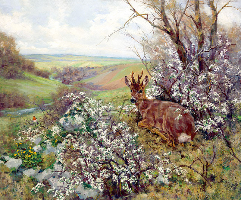 Кристиан Йохан Кронер (1838-1911) е ключова фигура в пейзажната традиция на Германия, особено през късния романтизъм и началото на 20-ти век. Стилът на Кронер обаче остава здраво вкоренен в романтичните конвенции, като дава приоритет на експресивната работа с четката и емоционалния резонанс пред стриктното придържане към фотографския реализъм. Изображенията на Кронер на животни – особено на елени – са били ценени заради анатомичната си прецизност и емоционално качество. Той щателно изучава мускулатурата и скелетната структура на животните, превръщайки научните си знания в завладяващи визуални изображения. Тези картини се характеризират със светещи цветови палитри и динамични композиции, които предават усещане за движение и жизненост. Неговата непоколебима отдаденост на наблюдението и интерпретирането на природата, съчетана с майсторството му на техниката на рисуване, го утвърждава като защитник на романтичния идеализъм и затвърждава мястото му сред най-уважаваните пейзажисти в Германия.