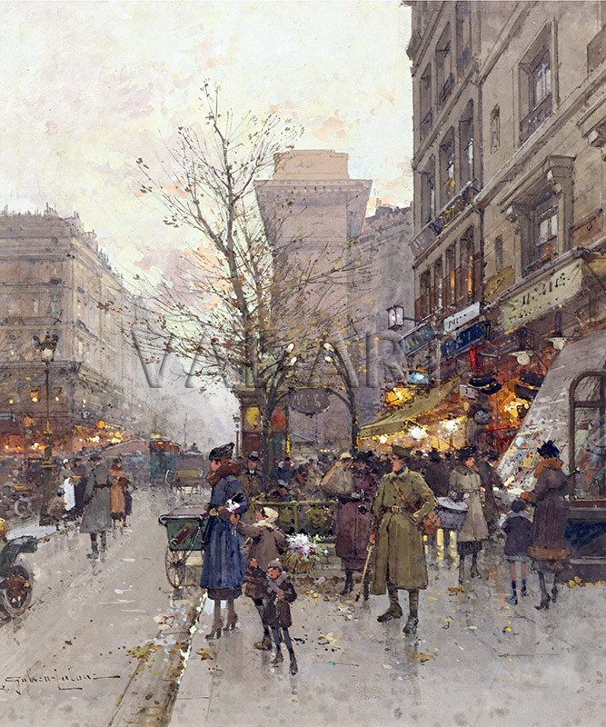 Юджийн Галиен - Лалу (1854 - 1941) е признат за един от най-добрите майстори на френските импресионистични улични сцени. От 1877 г. той е ученик на Шарл Лалу, дългогодишен член на Френските художници, престижна френска художествена асоциация. Изключително надарен, Галиен-Лалу става известен в началото на века с това, че улавя самата атмосфера на Париж върху платното си. Работейки с гваш с леки, деликатни щрихи, Галиен-Лалу притежава необикновената способност да създава илюзията за детайлност в импресионистичен стил. Добре познати във Франция, неговите картини от началото на 1900 г. точно представят епохата, в която е живял - щастливите, оживени парижки дни на конски карети, трамваи и първите омнибуси. Типична картина на Галиен-Лалу изобразява сцени от парижки тротоари и булеварди, претъпкани с хора, или туристи от началото на века, смесващи се пред паметниците на столицата. Пионер в популяризирането на рисуването на улични сцени, Галиен-Лалу е вдъхновил и повлиял на много художници, включително известните френски импресионисти Едуар Кортес и Антоан Бланшар.