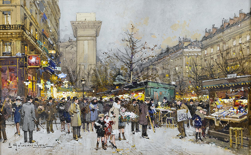 Юджийн Галиен - Лалу (1854 - 1941) е признат за един от най-добрите майстори на френските импресионистични улични сцени. От 1877 г. той е ученик на Шарл Лалу, дългогодишен член на Френските художници, престижна френска художествена асоциация. Изключително надарен, Галиен-Лалу става известен в началото на века с това, че улавя самата атмосфера на Париж върху платното си. Работейки с гваш с леки, деликатни щрихи, Галиен-Лалу притежава необикновената способност да създава илюзията за детайлност в импресионистичен стил. Добре познати във Франция, неговите картини от началото на 1900 г. точно представят епохата, в която е живял - щастливите, оживени парижки дни на конски карети, трамваи и първите омнибуси. Типична картина на Галиен-Лалу изобразява сцени от парижки тротоари и булеварди, претъпкани с хора, или туристи от началото на века, смесващи се пред паметниците на столицата. Пионер в популяризирането на рисуването на улични сцени, Галиен-Лалу е вдъхновил и повлиял на много художници, включително известните френски импресионисти Едуар Кортес и Антоан Бланшар.