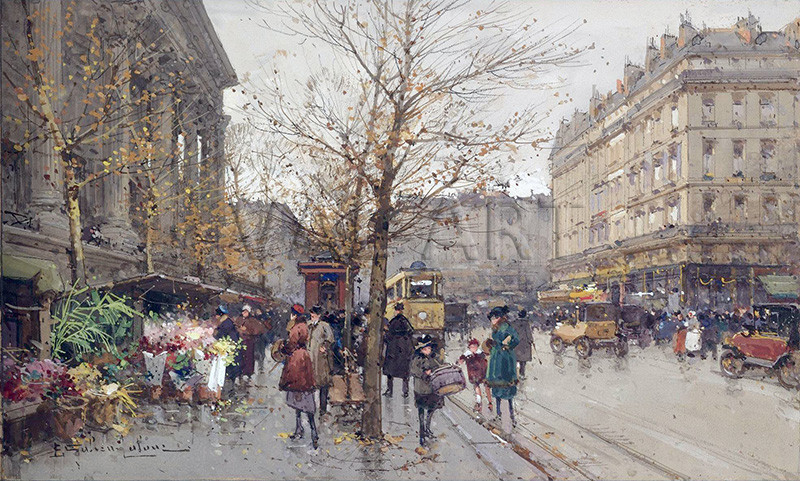 Юджийн Галиен - Лалу (1854 - 1941) е признат за един от най-добрите майстори на френските импресионистични улични сцени. От 1877 г. той е ученик на Шарл Лалу, дългогодишен член на Френските художници, престижна френска художествена асоциация. Изключително надарен, Галиен-Лалу става известен в началото на века с това, че улавя самата атмосфера на Париж върху платното си. Работейки с гваш с леки, деликатни щрихи, Галиен-Лалу притежава необикновената способност да създава илюзията за детайлност в импресионистичен стил. Добре познати във Франция, неговите картини от началото на 1900 г. точно представят епохата, в която е живял - щастливите, оживени парижки дни на конски карети, трамваи и първите омнибуси. Типична картина на Галиен-Лалу изобразява сцени от парижки тротоари и булеварди, претъпкани с хора, или туристи от началото на века, смесващи се пред паметниците на столицата. Пионер в популяризирането на рисуването на улични сцени, Галиен-Лалу е вдъхновил и повлиял на много художници, включително известните френски импресионисти Едуар Кортес и Антоан Бланшар.