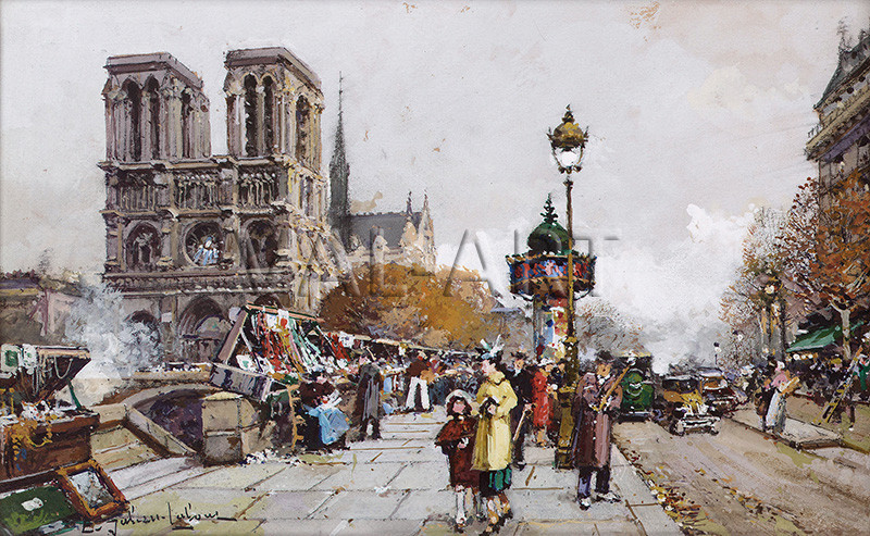 Юджийн Галиен - Лалу (1854 - 1941) е признат за един от най-добрите майстори на френските импресионистични улични сцени. От 1877 г. той е ученик на Шарл Лалу, дългогодишен член на Френските художници, престижна френска художествена асоциация. Изключително надарен, Галиен-Лалу става известен в началото на века с това, че улавя самата атмосфера на Париж върху платното си. Работейки с гваш с леки, деликатни щрихи, Галиен-Лалу притежава необикновената способност да създава илюзията за детайлност в импресионистичен стил. Добре познати във Франция, неговите картини от началото на 1900 г. точно представят епохата, в която е живял - щастливите, оживени парижки дни на конски карети, трамваи и първите омнибуси. Типична картина на Галиен-Лалу изобразява сцени от парижки тротоари и булеварди, претъпкани с хора, или туристи от началото на века, смесващи се пред паметниците на столицата. Пионер в популяризирането на рисуването на улични сцени, Галиен-Лалу е вдъхновил и повлиял на много художници, включително известните френски импресионисти Едуар Кортес и Антоан Бланшар.