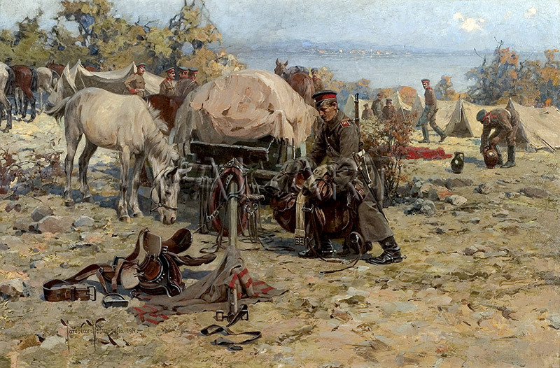 РЕПРОДУКЦИИ НА КАРТИНИ Първи конен Софийски полк на бивак при Сароския залив на Мраморно море (1914)