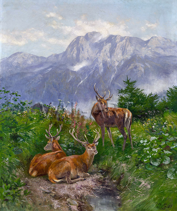 Йозеф Шмицбергер (1851-1936) е немски художник, известен с изобразяването на ловни сюжети, животни и пейзажи. Роден в Мюнхен, той получава първото си художествено образование от баща си. Шмицбергер учи в Кралската академия за изящни изкуства в Монако от 1868 г. и получава различни поръчки в Мюнхен като художник на лов, животни и пейзажи. Негови творби са публикувани в списание Gartenlaube, а той е член на Асоциацията на мюнхенските художници. Шмицбергер създава изображения на животни за тавана на Синята зала на замъка Херенкимзее и умира в родния си град след 1936 г.