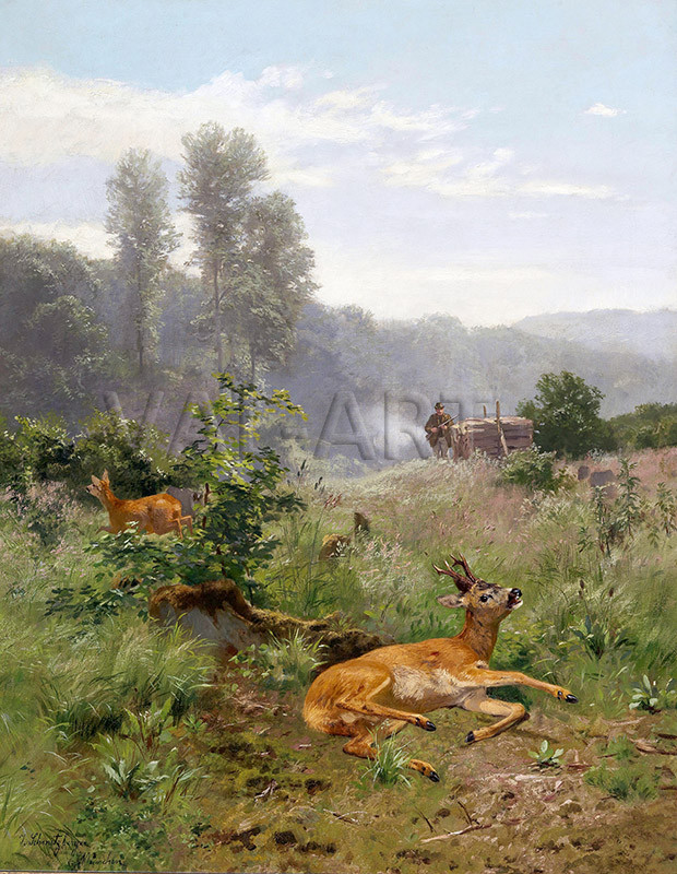 Йозеф Шмицбергер (1851-1936) е немски художник, известен с изобразяването на ловни сюжети, животни и пейзажи. Роден в Мюнхен, той получава първото си художествено образование от баща си. Шмицбергер учи в Кралската академия за изящни изкуства в Монако от 1868 г. и получава различни поръчки в Мюнхен като художник на лов, животни и пейзажи. Негови творби са публикувани в списание Gartenlaube, а той е член на Асоциацията на мюнхенските художници. Шмицбергер създава изображения на животни за тавана на Синята зала на замъка Херенкимзее и умира в родния си град след 1936 г.