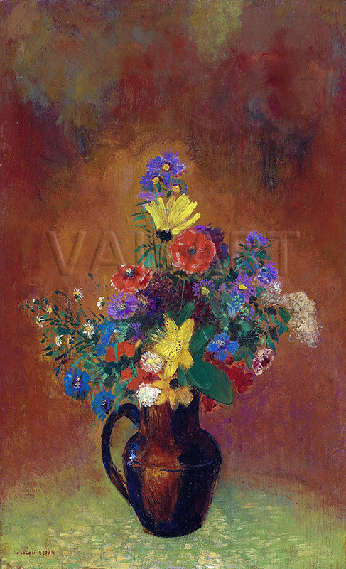 Одилон Редон (1840 – 1916) е известен френски художник, виден преставител на символизма. Той е ключова фигура в художественото движение от края на 19-ти век, преодолявайки пропастта между импресионистите и символистите. Известен е със своите ефирни, подобни на сънища произведения, които изследват вътрешните механизми на човешката психика, често изобразявайки митични същества, пленителни пейзажи и загадъчни фигури. Учи живопис в Париж при Жан-Леон Жером, а след това офорт и литография в родния си град при Родолф Брезден и е особено привлечен от произведенията на Рембранд и Делакроа. Кариерата на Редон започва със серия рисунки с въглен, наречени „ноар“, които се характеризират с мрачните си, фантастични сюжети и майсторското използване на светлината и сянката. През 1890-те години изкуството му претърпява голяма промяна: той приема цвета, обръщайки гръб на графичната работа в полза на маслените картини и пастелите. Това отчасти се дължи на влиянието на неговия приятел Пол Гоген. Редон е бил запален читател, а темите на неговите цветни произведения включват редица религиозни фигури и герои от класическата митология. Най-известните му картини обаче са натюрмортите с цветя, които започва през 1900 г. и създава в големи количества. Уникалният подход на Редон към символизма, който набляга на внушението и двусмислието пред буквалното представяне, оказва дълбоко влияние върху развитието на съвременното изкуство и той остава известен със своята уникална визия и способността си да извиква мистериозното и възвишеното чрез изкуството си.