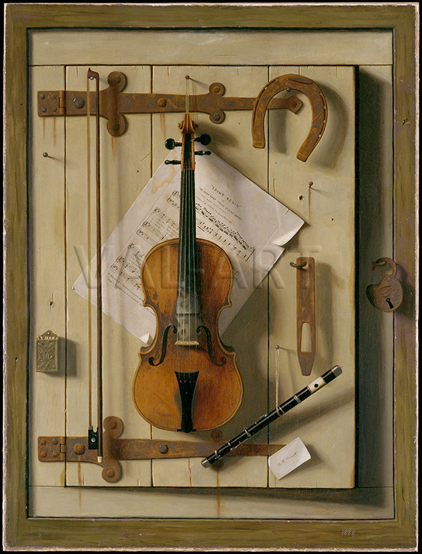 Натюрморт, цигулка и музика (1888) Тази сложна композиция може да изглежда на пръв поглед плоска, но в нея има дълбочина и пластичност, подчертаващи напрежението между илюзията и реалността. Изобразената врата на панти е леко открехната, а скромните предмети висят на изпъкнали гвоздеи, хвърляйки силни сенки. Инструментите и разкъсаните ноти на популярна ирландска песен подчертават хумористичното чувство за игра на Харнет, както и неговата ирландско-американска идентичност.